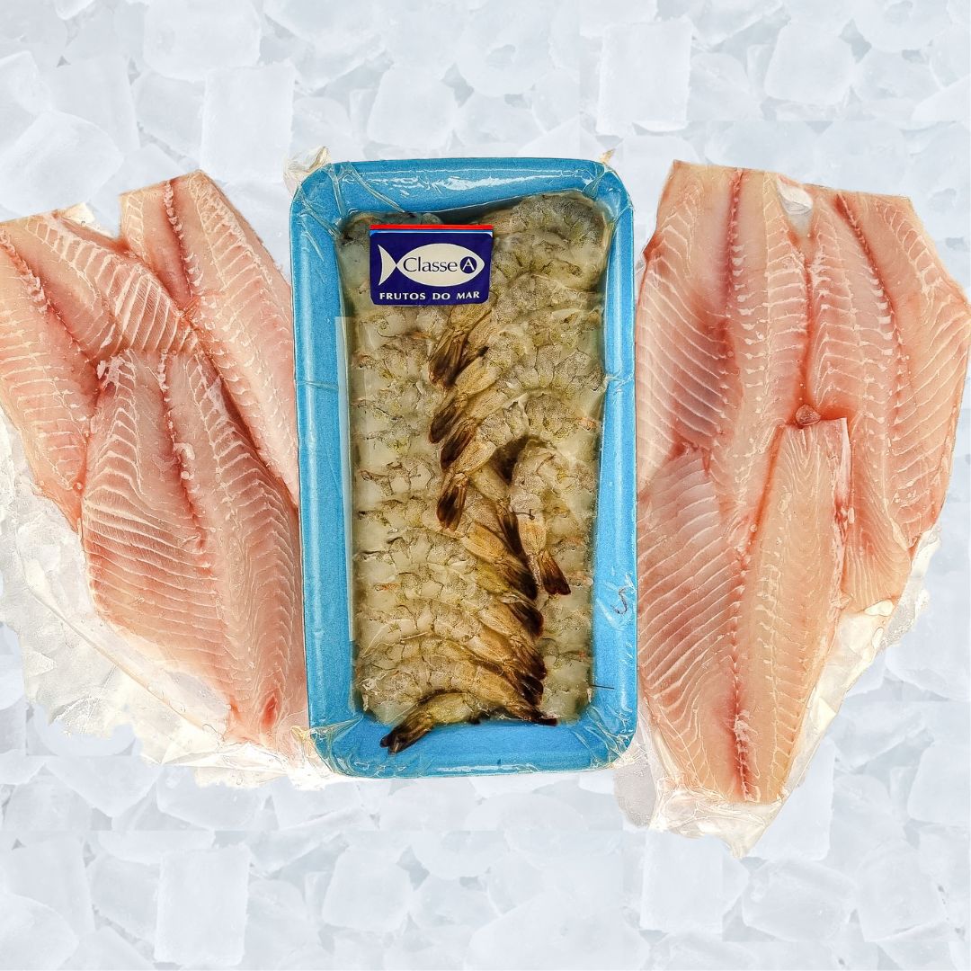 O Kit Peixe Fresco Tilápia e Camarão Cinza da Classe A , vem contendo 2 embalagens de filé de Tilápia sem pele e sem espinho de aprox. 440g cada, e uma embalagem de Camarão Cinza descascado e eviscerado com aprox. 400g. O peso total é de 1,2 Kg. Esse kit foi pensado para você , que quer um produto bem fresquinho e receitas combinando peixes e camarões.